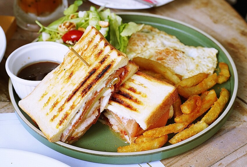 ▼煙燻鮭魚三明治份量大,富有兩顆太陽蛋、薯條、柚子醬沙拉。三明治內夾了大片的煙燻鮭魚、酸黃瓜、番茄、薯泥,都是很有飽足感的搭配,卻不失清爽。麵包用鷹牌麵粉製作,發酵時間長,吐司口感綿密且有足夠的麥香味。