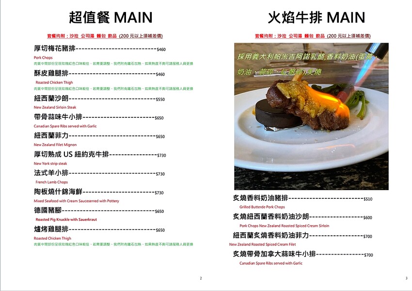 ▼白房子全日供餐,無休息時間,菜單內的菜色,在營業時段都有供應,注意最後點餐時間即可。這次造訪剛好趕上 2024 年菜單,種類有超值餐、新推出的火焰牛排系列、大拼盤、單點菜是、手沖咖啡、飲品、甜點、早午餐等。點一客排餐或超值餐均附有沙拉、公司湯、麵包、飲品。