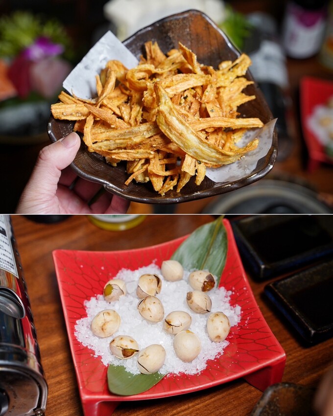 一上桌,還會招待這盤「炸牛蒡」,咬下去像洋芋片般酥脆,又帶有甜甜的滋味,非常涮嘴好吃!雖然是免費招,但真的神好吃!好吃到還問了店員是否有單獨販售XD很特別的是竟然吃得到「烤銀杏」,這可是高級日料店才會出現的!