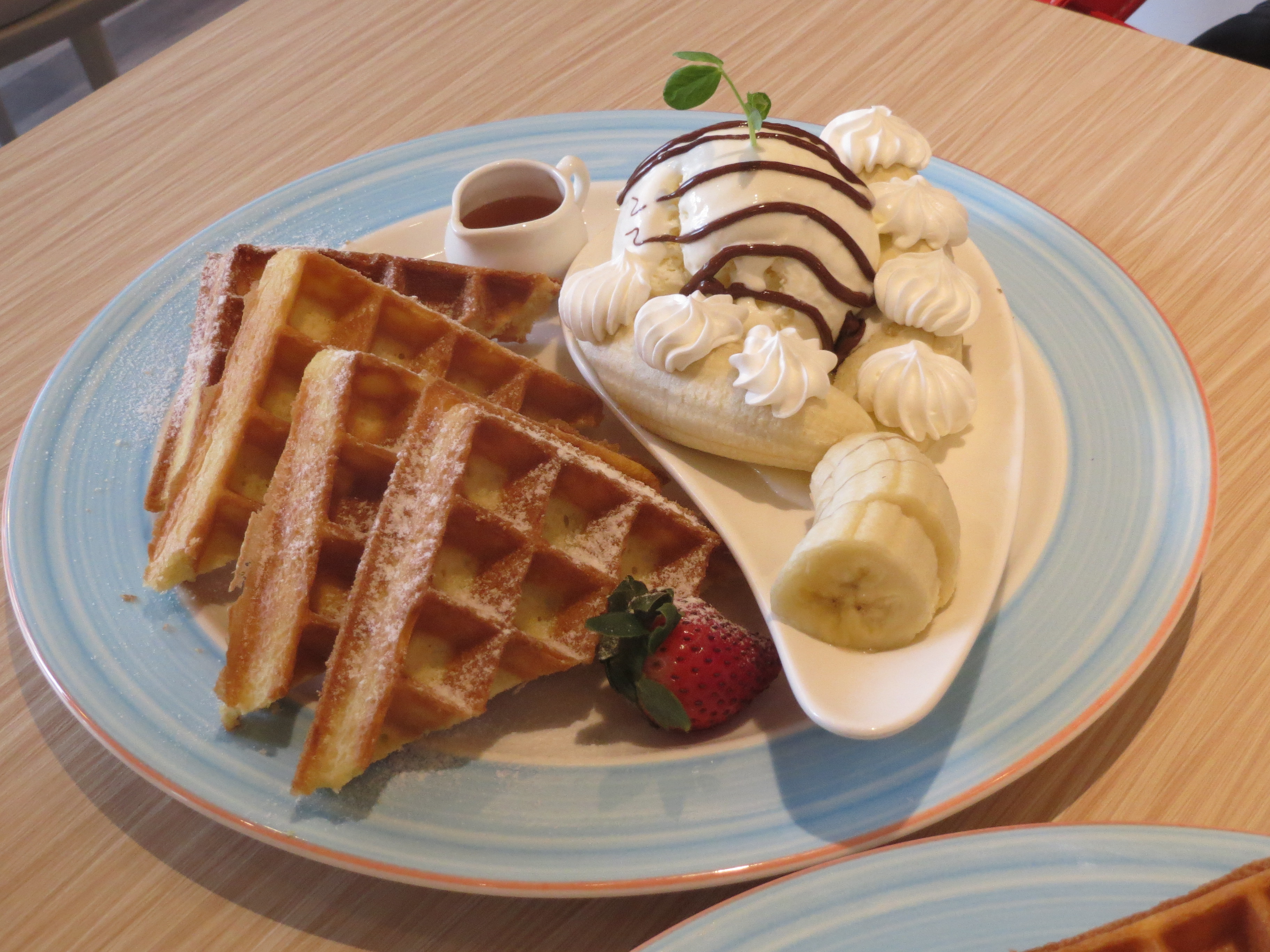 因為個人比較偏愛甜鬆餅,在四份鬆餅中,我會給香蕉船鬆餅最高的評價。除了擺盤方式很精緻,怎麼拍都好看的優點之外,它的香蕉和冰淇淋都有一定的水平。以往不甚討我歡心的奶油,因為店家的用心,也變得可愛起來。