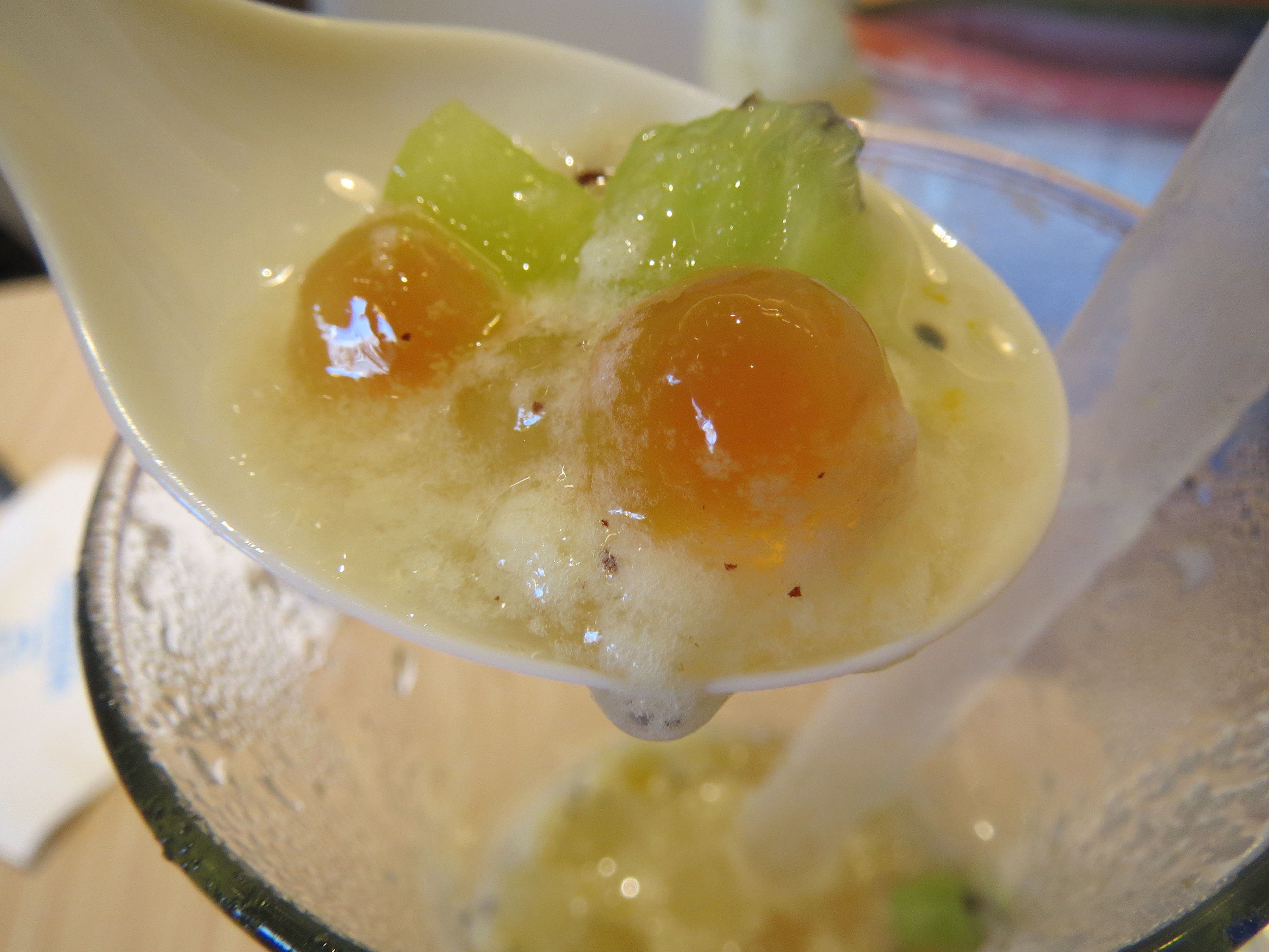 相較於稍後會介紹到的四份鬆餅,坦白說我更偏愛這杯水果切打飲。裡面的料異常豐盛,有彩色珍珠、奇異果果肉、寒天,以及似乎是蒟蒻的食材等等配料,其中讓我覺得最特別的就是明列子。這麼多種配料的組合讓它的口感層次變得十分豐富;甜度方面也很對我的胃口。而且完全沒有偷工減料,真的是滿滿一大杯
