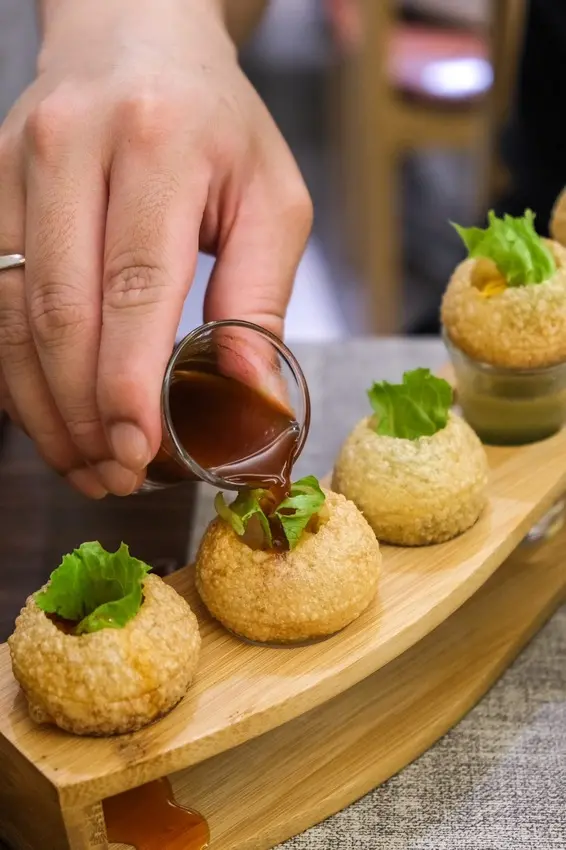 脆球內裝著鷹嘴豆泥倒入醬汁一起入口🤩