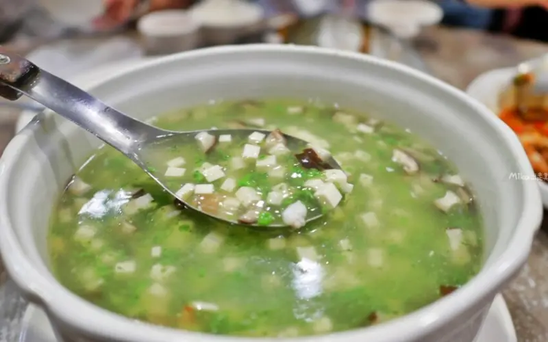 這道宴席常見的料理,料多味美,湯頭鮮甜。菠菜的綠意搭配豆腐、香菇等豐富配料,勾芡後的口感滑順飽滿,喝起來鮮美又有飽足感。