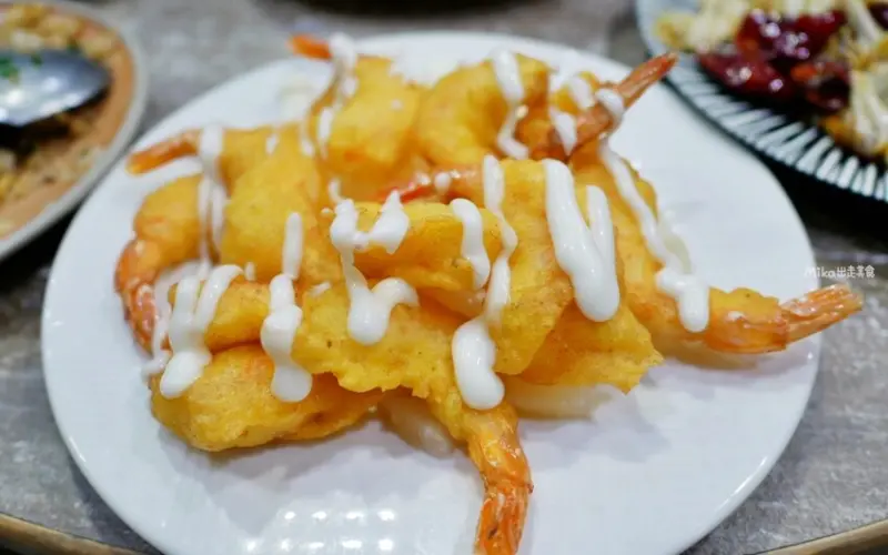 香酥的蝦球鋪上酸甜的鳳梨片,就是我們熟悉的鳳梨蝦球,炸得外酥內嫩,蝦子個頭又大,吃起來超過癮!