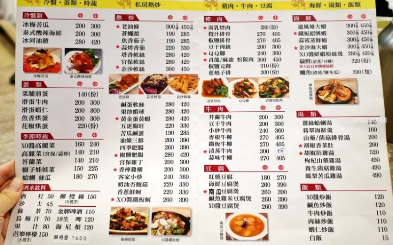 菜單包括冷盤、蛋類、時蔬、熱炒、湯品及飯類,價格約落在$110到$520之間。主打川粵料理,搭配台式熱炒,幾乎每道菜都是招牌,而其中的「老油條」更是必點招牌!