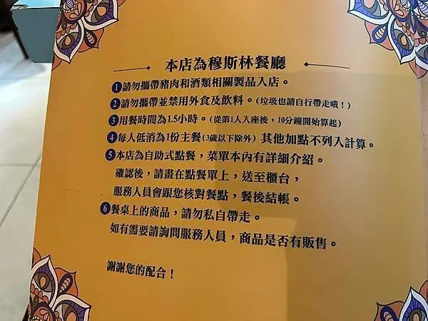 餐廳是穆斯林友好餐廳,所以禁止攜帶豬肉和酒,這點一定要注意不要踩線喔!