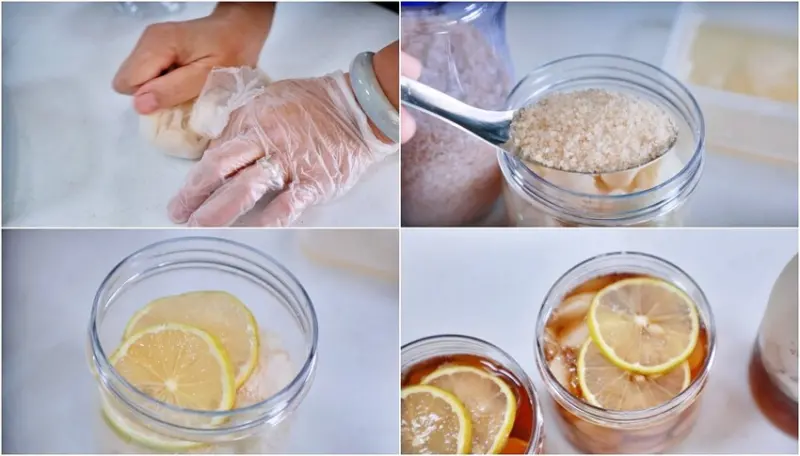 接著就要裝進袋子先用鹽巴洗過一次,在用糖洗一次,最後切上檸檬片再加上檸檬酵素就完成了。