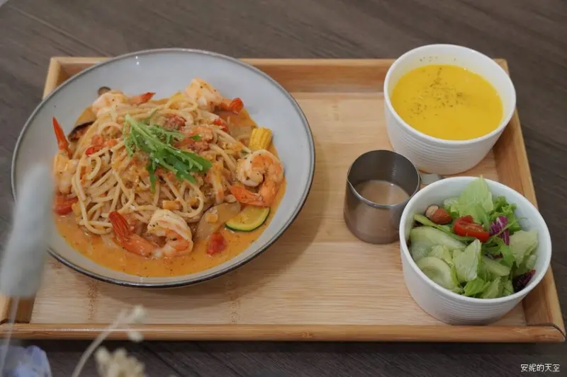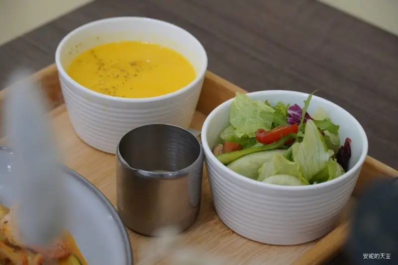 義大利麵還有附上一碗南瓜濃湯以及生菜沙拉。