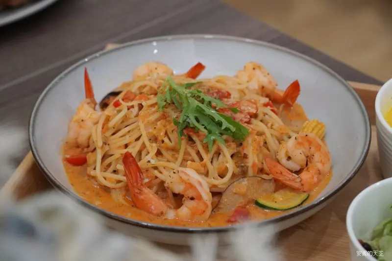 乾燒奶油醬汁帶點微辣口感,醬汁濃郁層次豐富,緊密包裹著每一根麵條,裡頭有貼心去殼的鮮蝦,以及玉米筍、櫛瓜等蔬菜,金黃色澤散發誘人的香氣,是一道會讓人猛吞唾液的美味義大利麵。