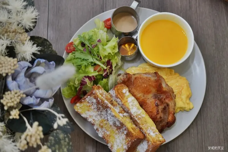 特愛早午餐的我選擇了雞腿排早午餐,在麵包選擇上更改成為法式吐司,早午餐很豐盛,有主餐(雞腿排)、法式吐司一份、嫩蛋、生菜沙拉以及南瓜濃湯。