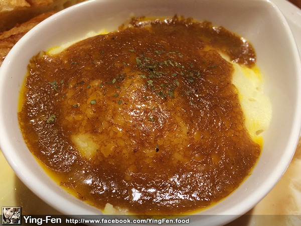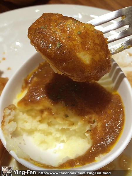 馬鈴薯先把皮消掉在切塊,再把他製作成泥狀,雖然馬鈴薯是泥狀,可以吃到鬆軟綿密的馬鈴薯泥帶有馬鈴薯塊,有不同口感混和好好吃,上面的醬是菲力牛排敦煮出來,有濃郁的肉汁,味道非常香。
