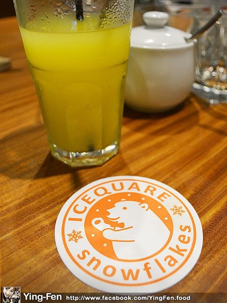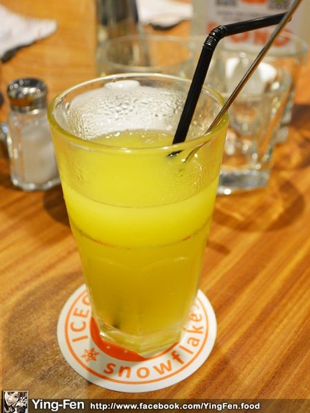 柳橙原汁,用新鮮柳橙榨出來,有自然酸甜味道,喝柳橙汁還可以吃到柳橙果粒,底下的杯墊很可愛是店家的LOGO商標。