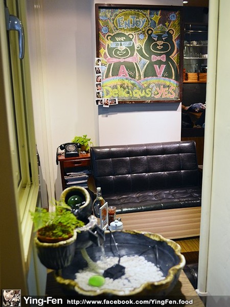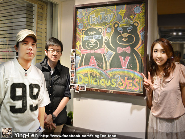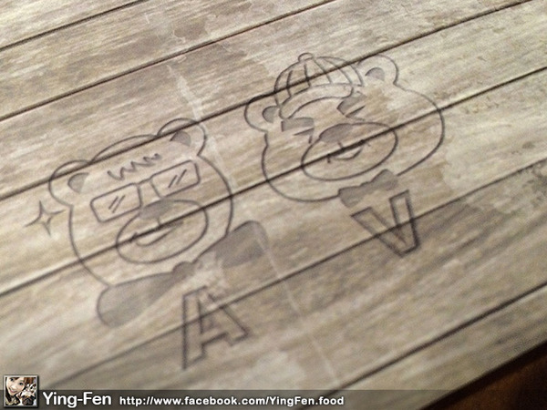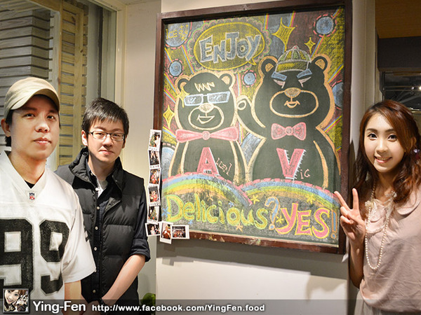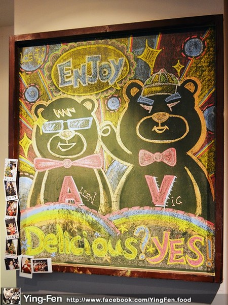 牆上有黑板壁飾,上面用粉筆畫出兩隻熊好可愛,粉筆選用白色、黃色、粉紅和粉藍,整體看起來好繽紛歡樂的感覺,這兩隻熊代表了兩個老闆,A是Allen,V是Vicky,這兩隻熊有老闆一樣的造型,一個是戴眼鏡,另一個老闆是戴帽子,有空你們到店家用餐看一下就知道啦。