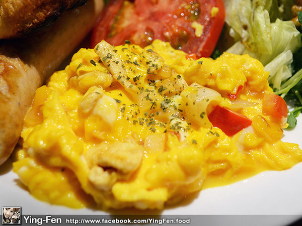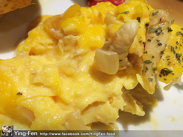 蛋吃起來很軟嫰,很滑嫰順口,蛋裡面還有料,滑蛋不只是只有蛋,裡面還有加洋蔥、雞肉、黃色青椒、培根。