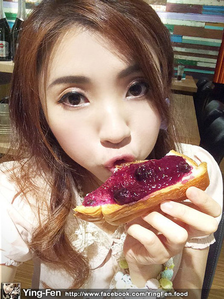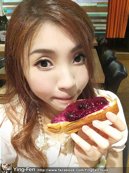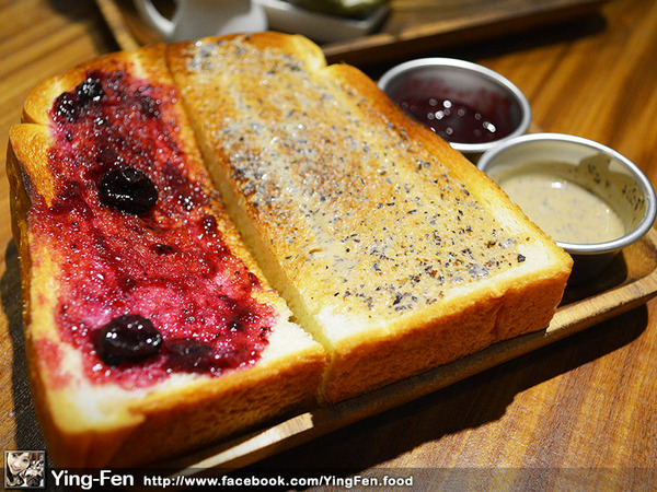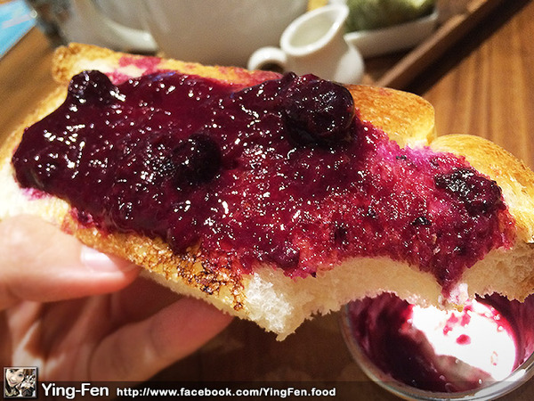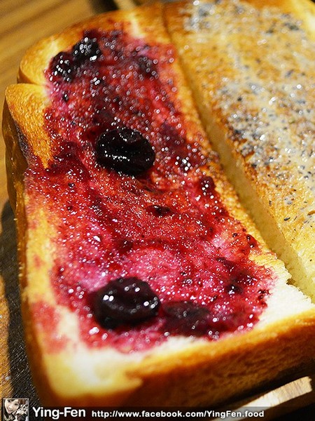 接下來是加厚厚的醬料在上面,厚片土司有好香的奶油味道,麵包口感鬆軟,上面醬料是草莓+藍莓。