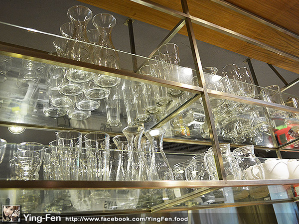 上面有個銀色金屬的鐵架,鐵架上面有放置好多玻璃,每個玻璃形狀有點不太一樣,拍照效果很好看。