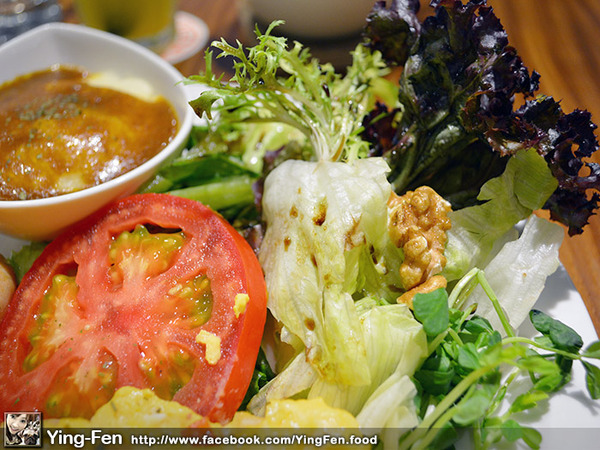 主餐旁邊的生菜好多,生菜有四種,上面黑色醬,是選用紅酒醋醬,味道很特別,有紅酒的香味非常好吃,另外有加幾顆吃起來的核桃,核桃吃起來甜甜的味道,有脆脆的口感,旁邊牛蕃茄好大一片,裡面保有好多水份。