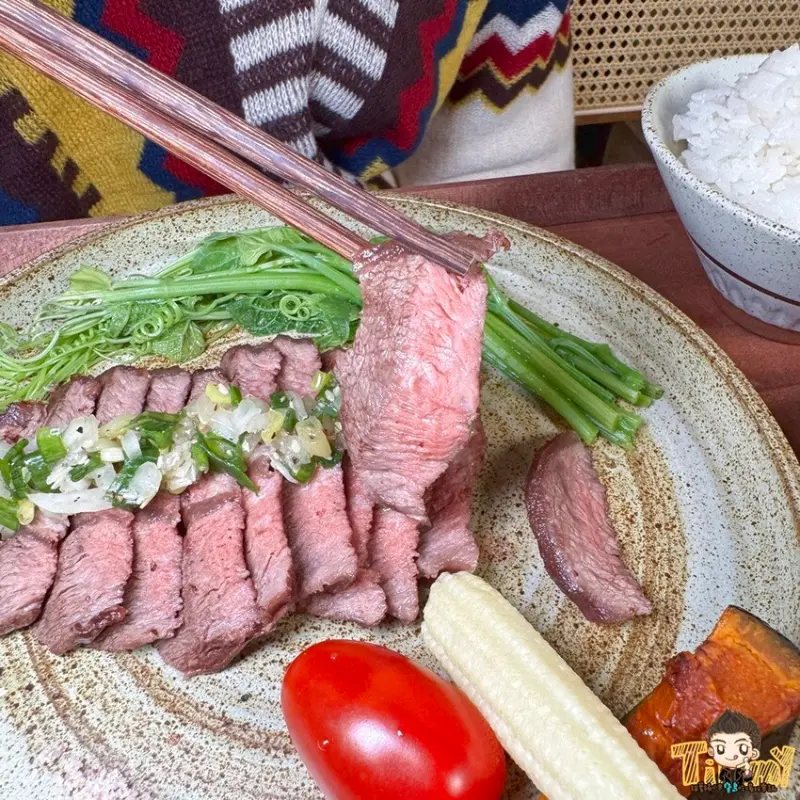 板腱牛排約5-7分熟,建議可以先吃原味,享受牛肉原始風味,嫩中帶嚼勁的口感,會越嚼越甜喔