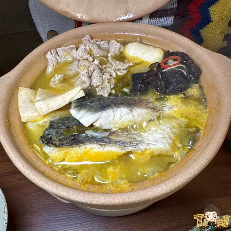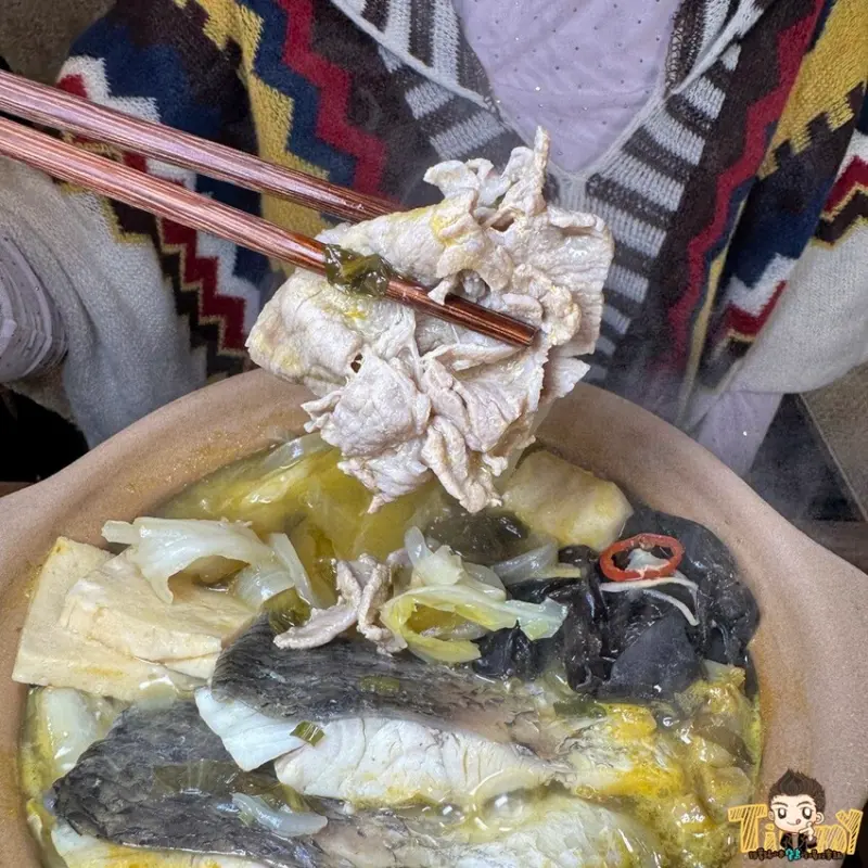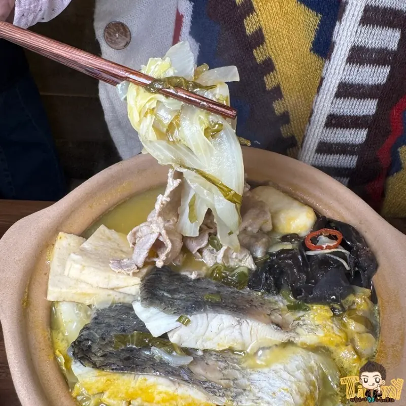 小彤魚最喜歡的嬤嬤酸菜魚(420元),使用台灣金目鱸魚菲力、職人醃製的酸菜、梅花豬肉片等食材一起熬煮。