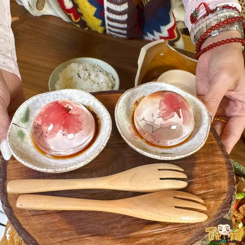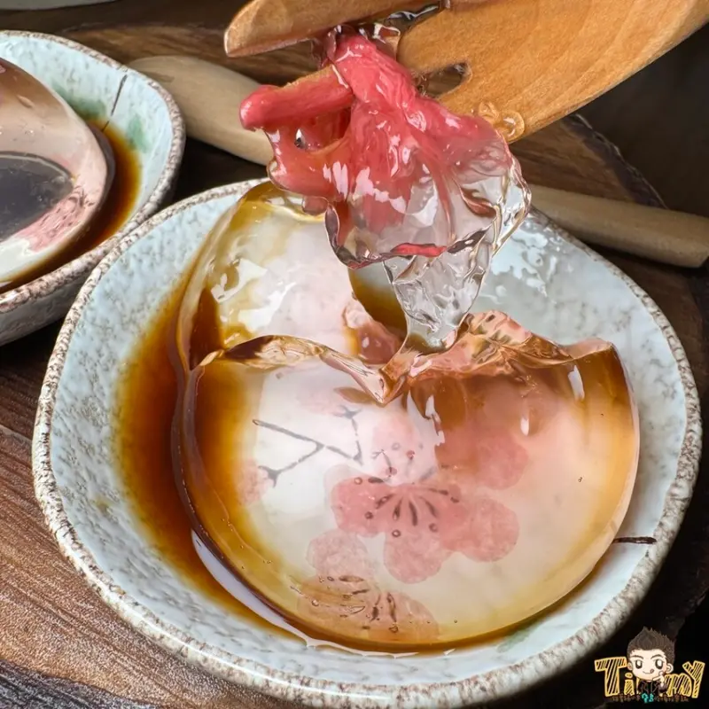 櫻花水信玄餅(180元)搭配黑糖糖漿和台灣黑糖,水信玄餅滑嫩的口感,加上鹽漬櫻花和香甜黑糖蜜,是傳統的日式甜點。