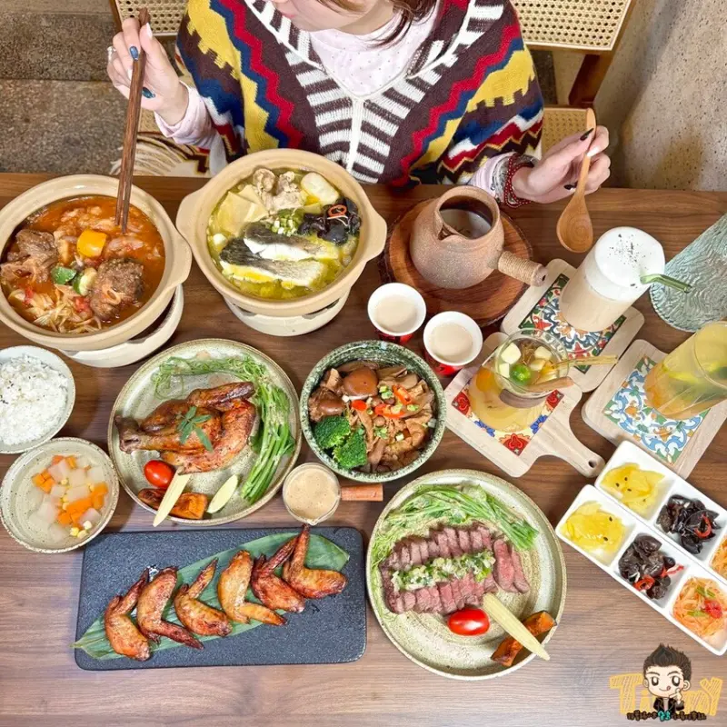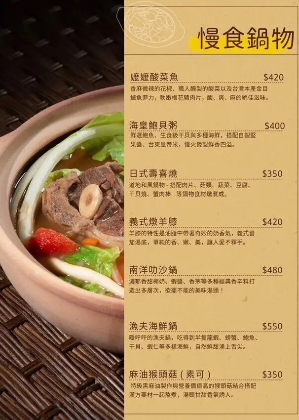 餐點選擇性豐富,手作松食和慢食鍋物是個人套餐,套餐包含前菜、主食、湯品和甜品