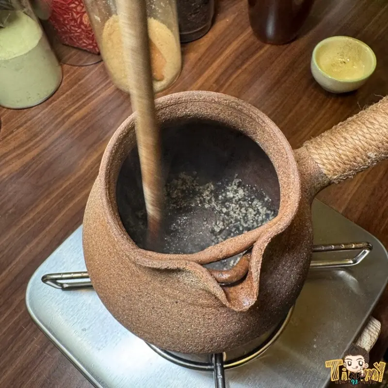 土壺烤奶(200元),土壺內加砂糖炒至微微溶化後,加上茶葉繼續拌炒。