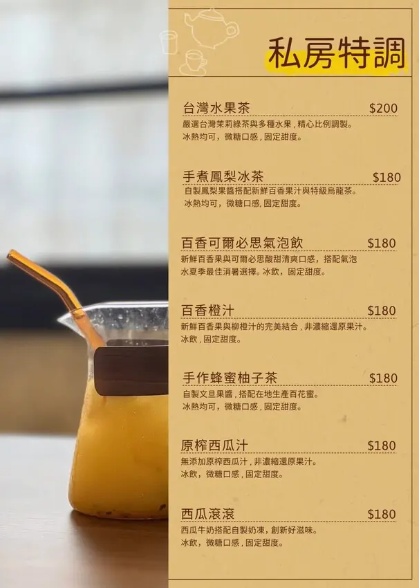 手作蜂蜜柚子茶(180元)自製文旦果醬,搭配在地生產的百花蜜調配而成,清爽解膩~