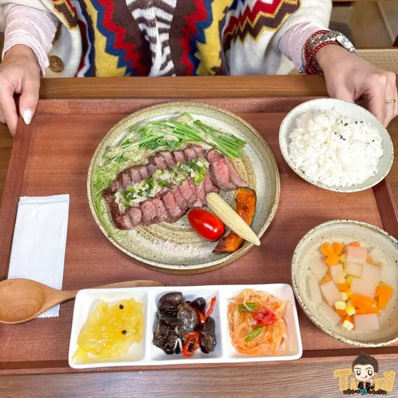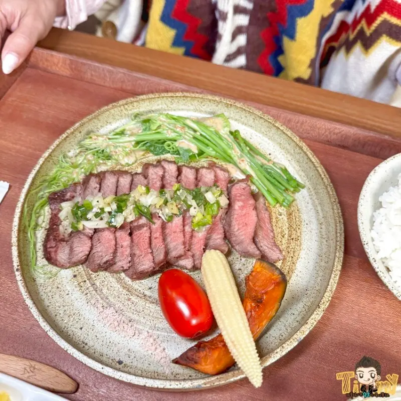 想要吃牛肉的朋友可以點蔥鹽板腱牛排(400元),選用美國Prime等級板腱牛排,搭配店家自製蔥鹽醬、玫瑰鹽、胡麻龍鬚菜等配菜。