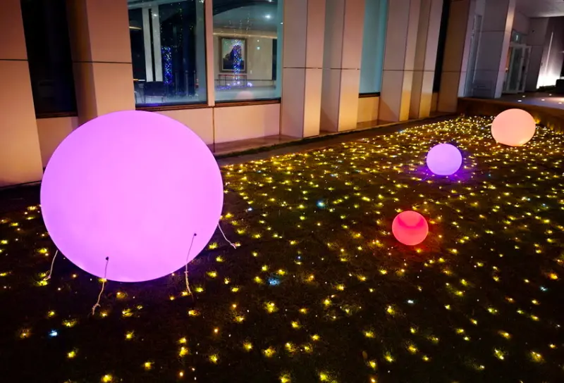 彩色的大小球散落在閃閃發光的草叢中,像是走在宇宙的閃耀星海中,球體不時變換顏色,彷彿置身幾米的夢幻世界。