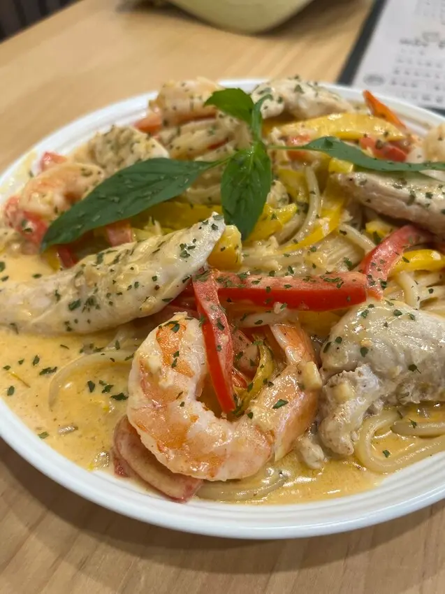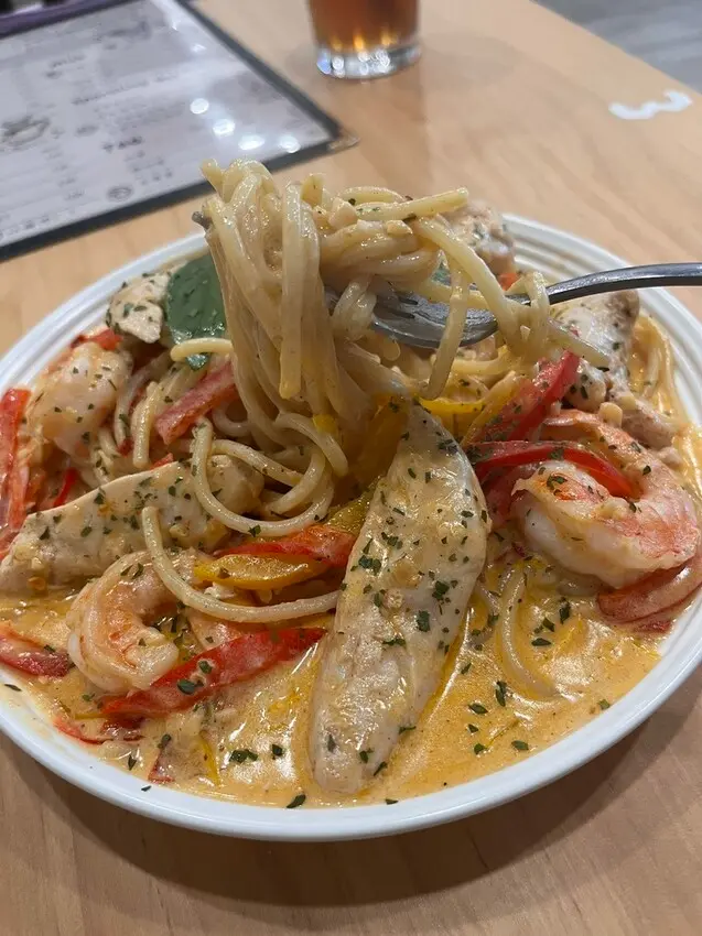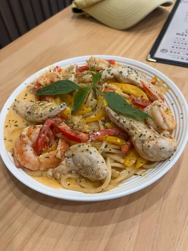 這盤義大利麵一上桌,真的讓人食慾大增!麵的分量雖然不算多,但雞肉是超大塊,蝦子也剝好殼了,超貼心!醬汁給得非常足,濃郁的白醬帶一點蒜香,吃起來完全不膩,我是一口接一口停不下來。還加了甜椒,口感更豐富!我覺得其他口味應該也值得試試看。