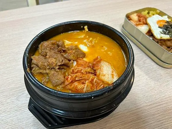 泡菜起司湯鍋原本附有一碗白飯,我告訴店家不需要白飯,店家貼心地幫我改成多加一份肉,非常加分!湯鍋內的食材超豐富,有肉片、雞蛋、豆腐、泡菜、起司、年糕等等,滿滿的料讓這鍋130元的湯鍋顯得超值!湯鍋的湯頭濃郁鮮美,特別是肉片經過煎烤後,增添了濃厚的香氣,與泡菜湯底融合,讓整鍋的味道更加豐富、迷人。烤過的肉片味道稍鹹,但配上白飯剛剛好,非常下飯!這鍋湯的份量驚人,我甚至吃不完,最後還外帶回家,分成兩餐享用,對女生來說,真的超大份又超滿足!