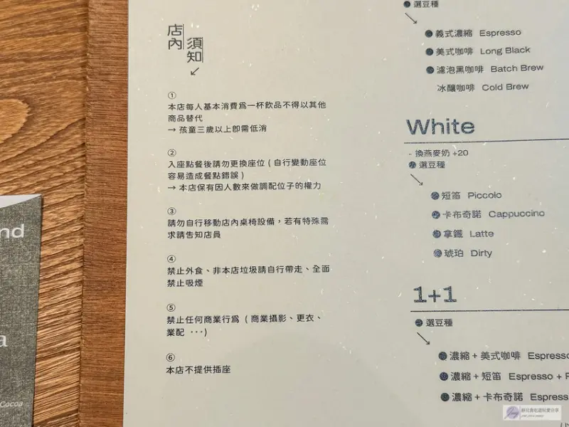菜單主打手沖單品咖啡、特調咖啡及多款飲品,甜點則以每日提供內容為準,價格區間在$100~$260之間。內用每人低消一杯飲品,我們這次去時甜點已全數售完,真是讓人忍不住想再訪。