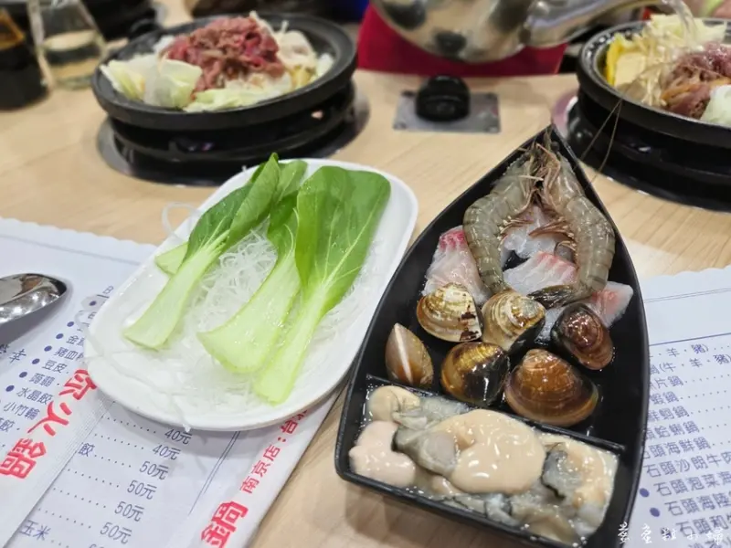 海陸鍋如照片一鍋已放好牛肉片的石頭鍋,一盤海鮮和一份冬粉加青菜。