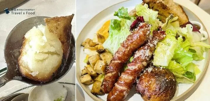 二條飽滿結實的法式手工腸,表皮焦脆爽口,煎過的杏鮑菇丁QQ軟軟的,味道不錯。