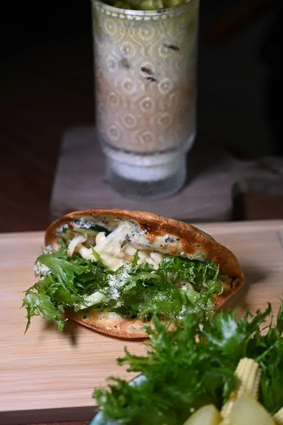 薄餅加上松露醬,特別好吃,上面還鋪上滿滿的蕈菇與蔬菜,好吃又養生。