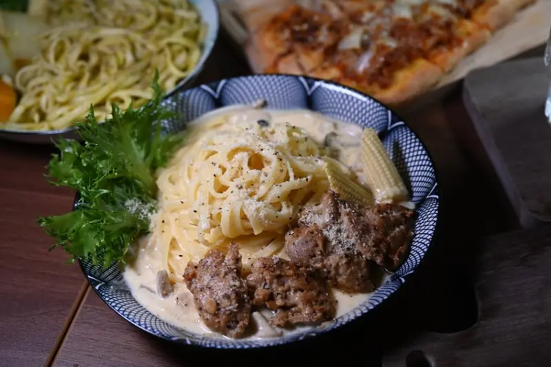 這道義大利麵加了金沙醬調味,搭配濃郁的奶香,鹹香夠味,意想不到的好吃 !
