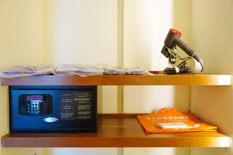 房間裡還貼心準備了私人保險箱,貴重物品可以安心放進去,讓你住得更放心!另外,還有舒適的室內拖鞋可以穿,細節做得很周到。最驚喜的是,居然還提供了一台Dyson吹風機,吹頭髮不僅快速又舒服,瞬間感覺高級感加倍!