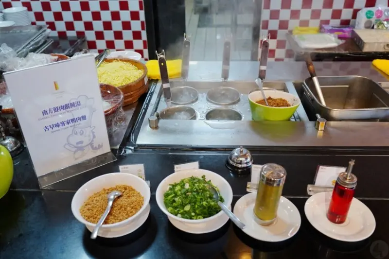 早餐還有現煮的南風鮮肉餛飩湯和古早味客家鴨肉麵可以選,真的超誘人!餛飩湯湯頭清爽,餛飩皮薄餡多;客家鴨肉麵帶著濃濃的古早味,每一口都很有家鄉的感覺。醬料還可以自己搭配,想吃什麼味道隨心調。