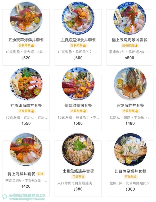 第一次造訪五漁村丼飯屋不知道要吃什麼的人,建議直點這碗「極上五漁海景丼」,一次享有季節魚7片、季節蝦2隻、干貝、星鰻、比目魚鰭邊肉、鮭魚卵等九種生魚片,看當天老闆進什麼魚種,新不新鮮老闆都會親自品嘗過才會端上桌給客人食用,所以新鮮度跟美食度絕對不用懷疑。
