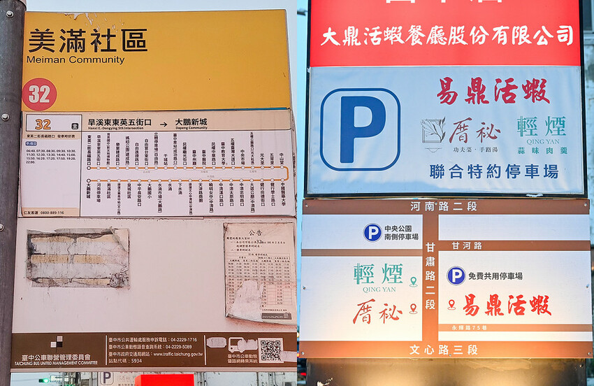 易鼎活蝦台中店位在甘肅路上靠近水湳中央公園南側停車場,旁邊有大鼎活蝦集團:易鼎活蝦、厝秘、輕煙的聯合特約停車場,正門口也有公車站牌停靠,不管是自己開車或是搭乘交通工具都很方便。