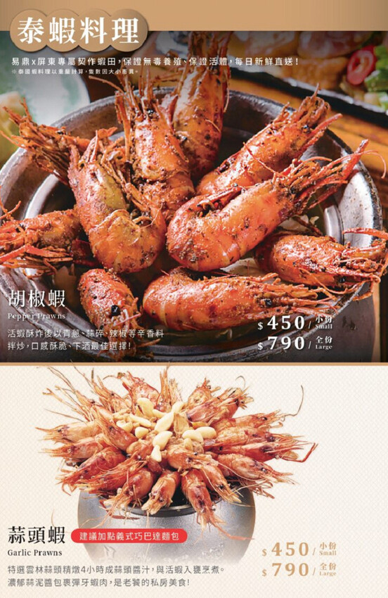 泰國蝦類的料理才有大份、小份之差,都是固定重量計價。