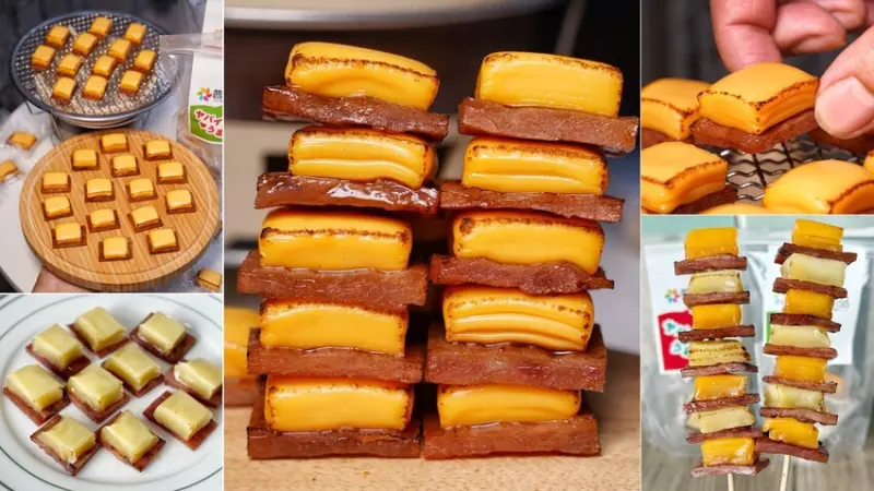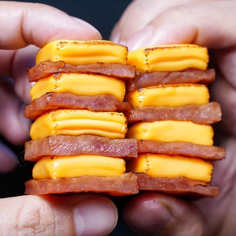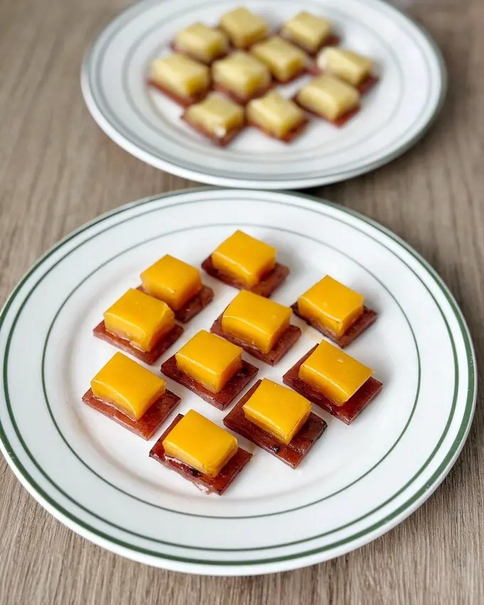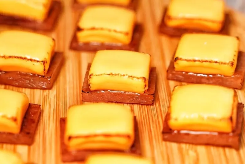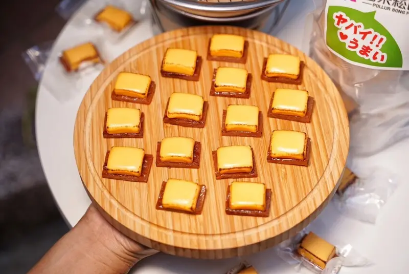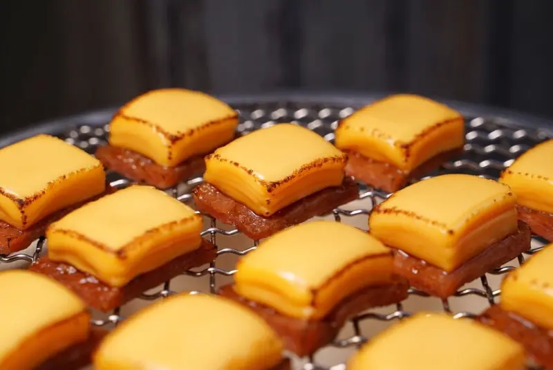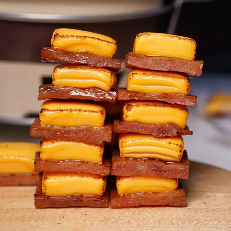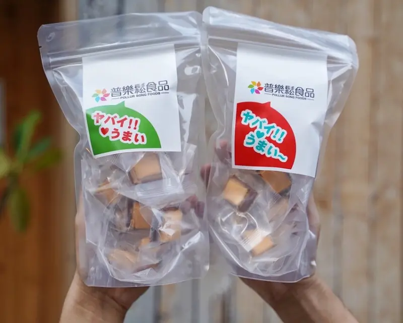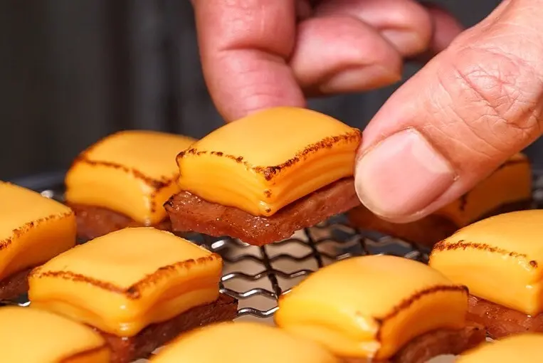 普樂鬆食品選用台中40年老店蜜汁肉乾,一片片手工慢火烘烤,把肉汁鎖在裡面,肉乾切片後再放上一塊塊德國進口切達起司,六層起司加上厚實彈牙的蜜汁肉乾,還帶有大火炙燒的香氣,光看就覺得很欠吃!