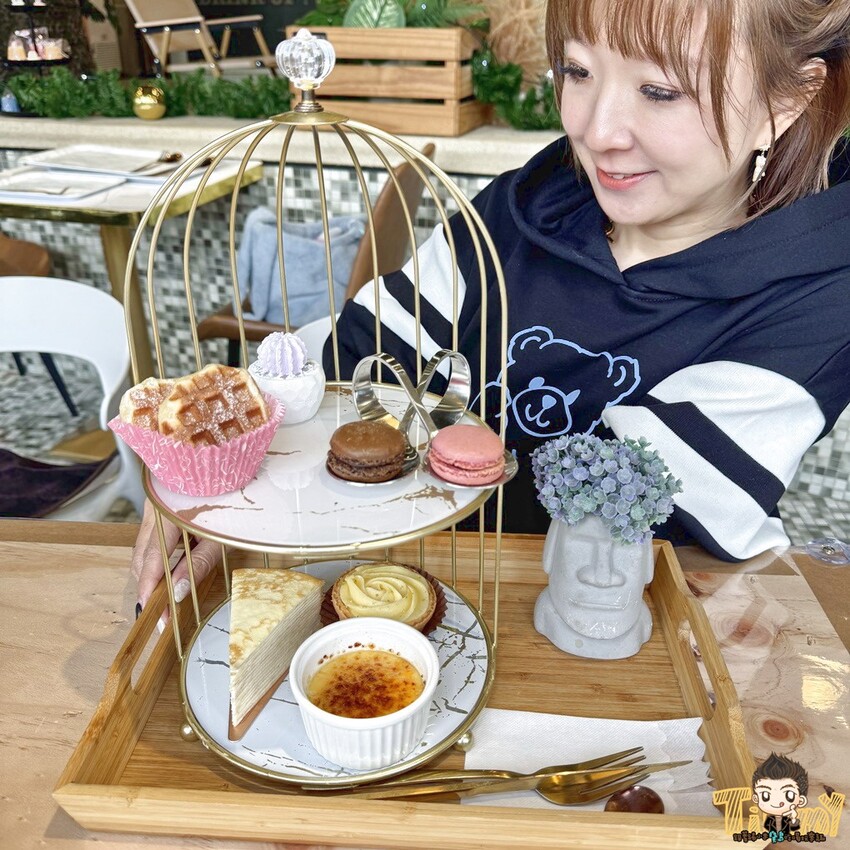 悠閒下午茶套組(380元)鳥籠造型的點心架盛裝法式千層、玫瑰檸檬塔、繽紛馬卡龍、韓風Q鬆餅和焦糖布蕾。