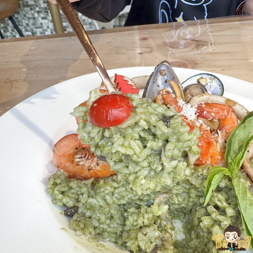 青醬挺濃郁的,加上燉飯帶米心的口感,讓人一口接一口吃不停,小朋友也會很喜歡喔