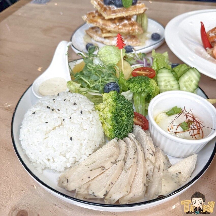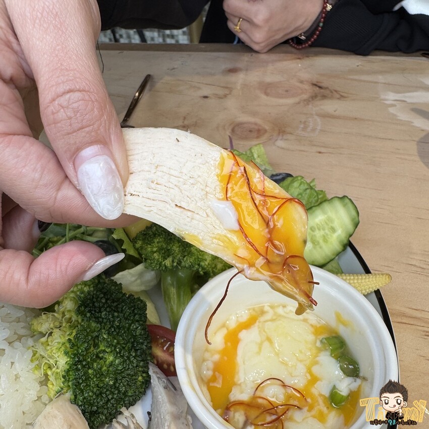 田園野蔬溫泉蛋佐香草雞胸飯(370元)適合喜愛健康的朋友。