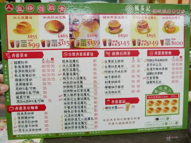 楓茶記的菜單看起來品項很多,不過分類就是飲料和菠蘿包,蠻特別的是,雖然大品項只有這兩樣,但光是菠蘿包就有17種口味,甜的鹹的都有,非常的有創意。飲料除了港式的絲襪奶茶、咖啡系列,也添加了台灣綠茶、春茶和紅茶。