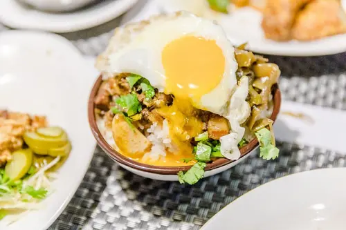 上頭的半熟荷包蛋,戳破後裡頭的蛋黃液徐徐流出,均勻的沾裹米飯,意味廚房的滷汁鹹鹹甜甜,比較偏南部的口味,非常合我口味,吃起來甜而不膩非常的幸福~