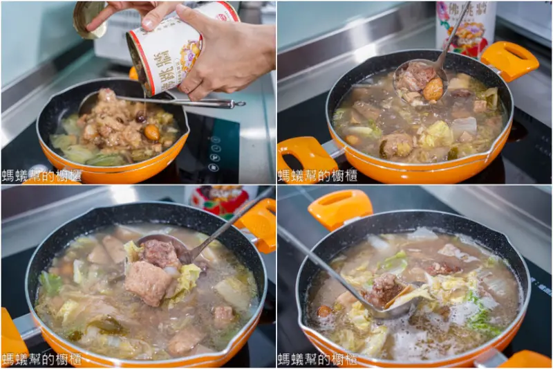 可加入大白菜或者高麗菜增加口感,蔬菜記得事先煮熟,將易開罐打開倒入鍋子裡,依照個人口味添加食用水後加入蔬菜,佛跳牆裡有干貝、芋頭塊、秀珍菇、鵪鶉蛋、魷魚、豬肉、筍塊等,一罐裡面盡是滿滿好料,湯頭鮮美甘甜,輕鬆就能吃到餐廳級燉湯。