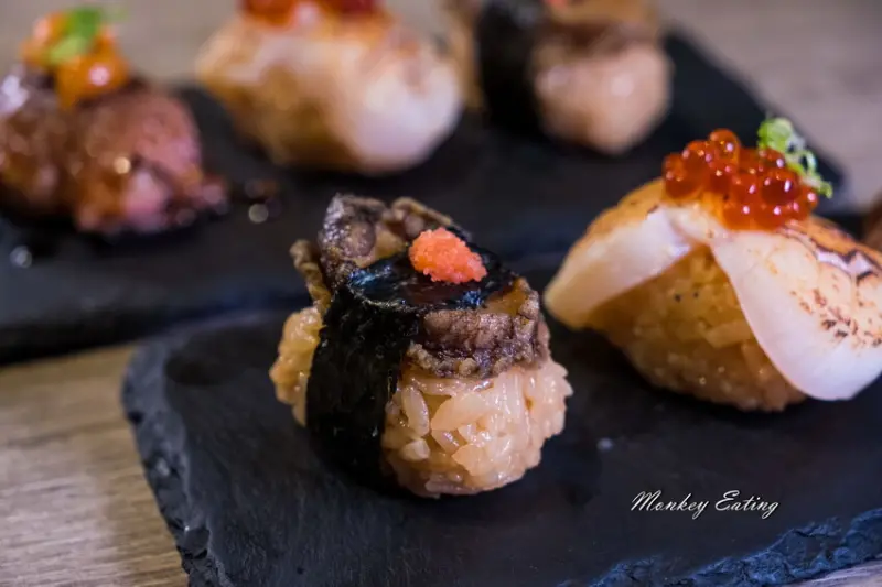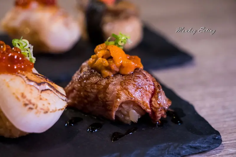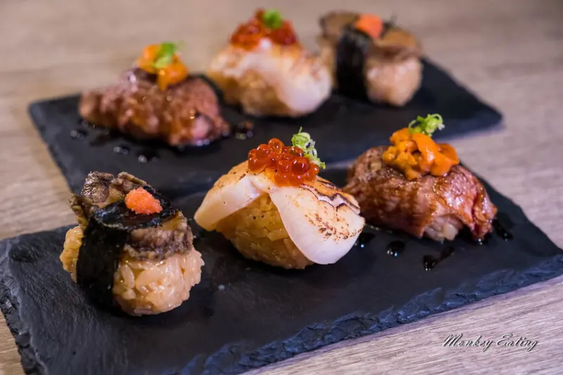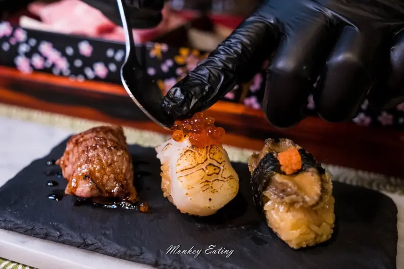 師傅現場捏握壽司桌邊秀,可以吃到和牛、干貝、鮑魚等高檔食材握壽司,上面還有鮭魚卵、海膽、明太子作點綴,整體奢華感再度拉滿。