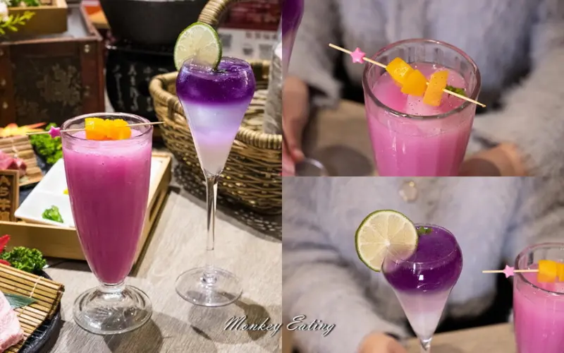 除了基本附上的飲品部分,也是可以加購升級其他特調飲品,這次選了紫蘭MOJITO、水蜜桃可爾必思冰沙,不僅顏色吸睛誘人,裡頭還很有料!紫蘭MOJITO是無酒精,開車朋友可以放心點,蝶豆花的漸層超級美,裡面還有QQ的荔枝晶凍。水蜜桃可爾必思口感香甜,還附上水蜜桃果肉可以品嘗,女生應該會很愛。